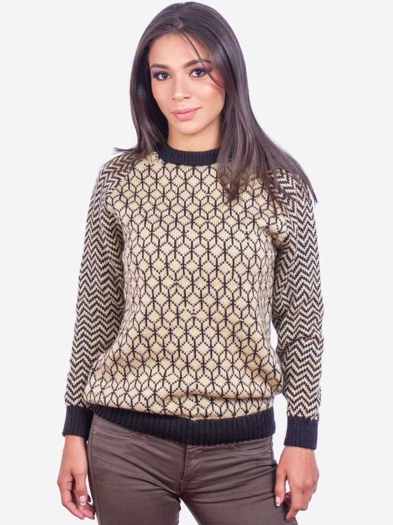 This awesome women´s sweater with modern details is knitted in Peru with alpaca wool. It has a bicolor combination with black and beige, giving it a casual and chic look. Is light and very warm, making it the perfect choice for the winter season. You can use it in school, college or informal events.
