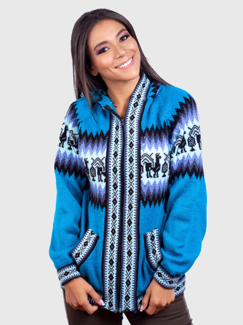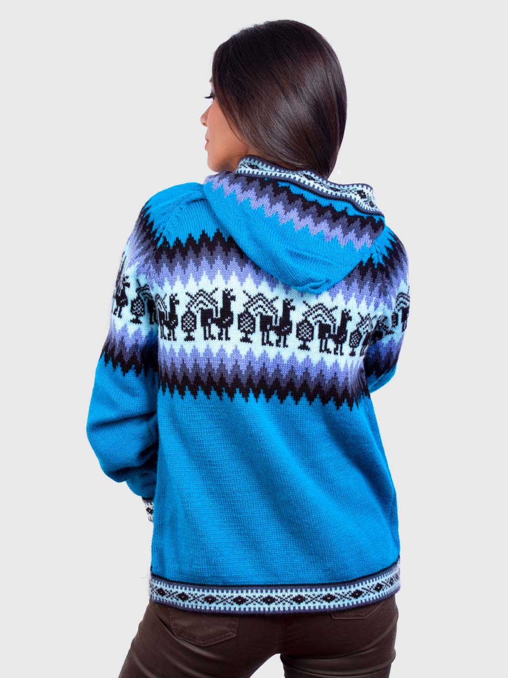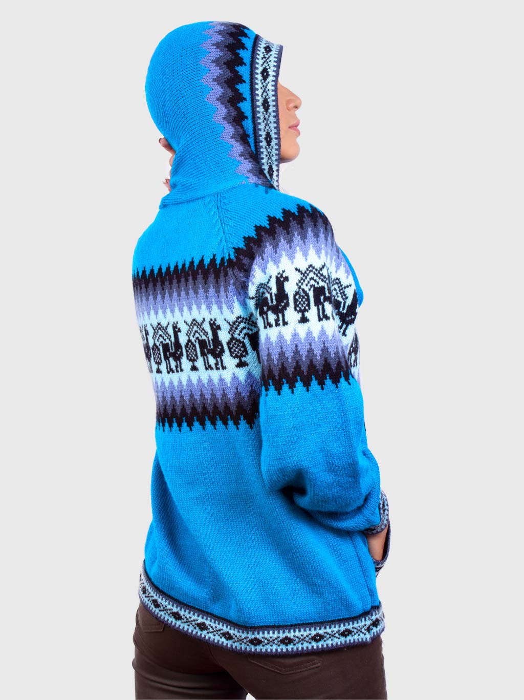 This beautiful turquoise knitted women’s sweater is handmade by Peruvians artisans with alpaca wool. It is a lightweight hooded garment, ideal for those cloudy days of fall and winter season.