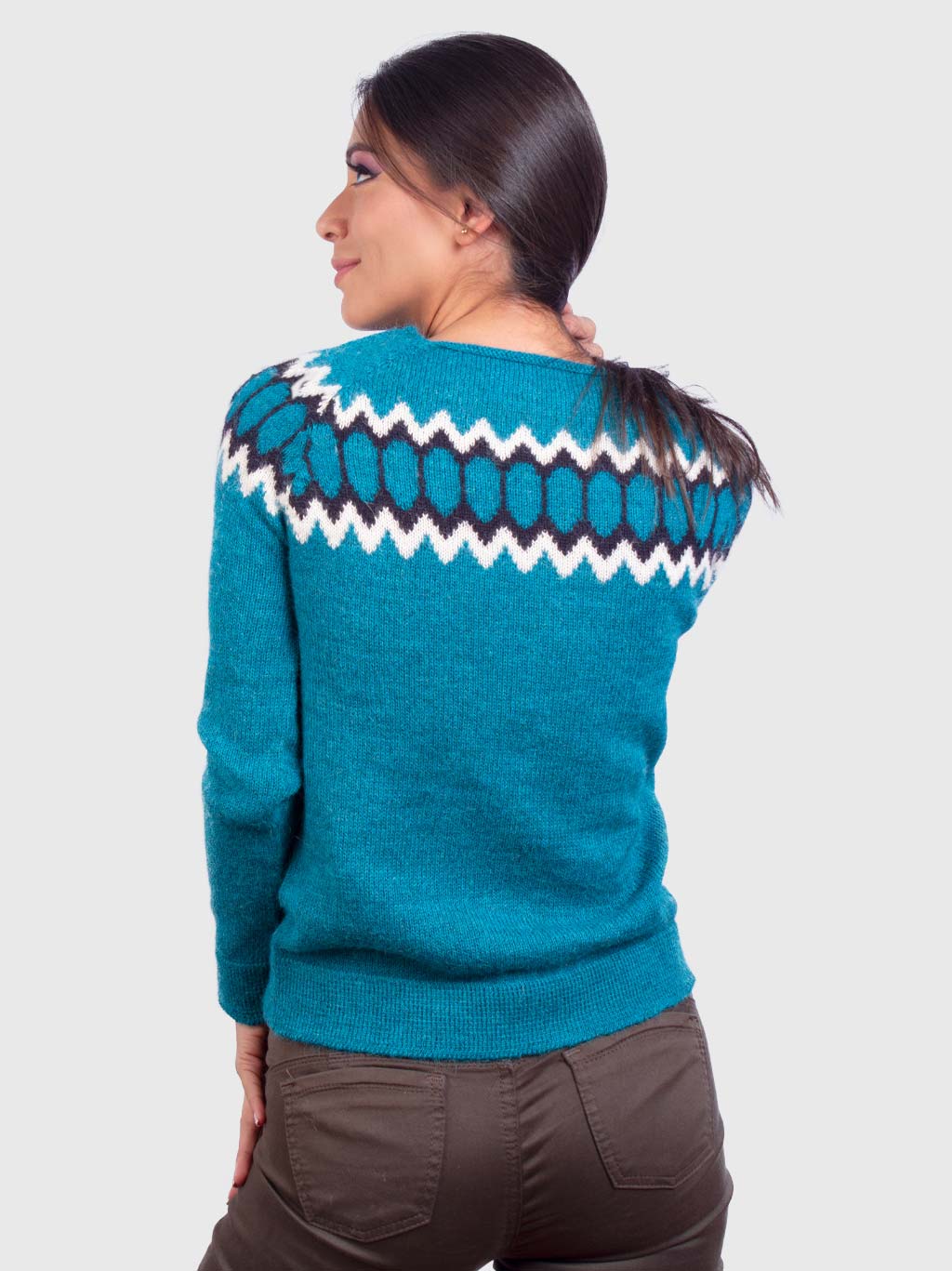 From Peruvian artisans comes this casual aqua island sweater for women with an attractive black and gray geometric pattern in the chest area. This garment is totally handmade with alpaca wool.