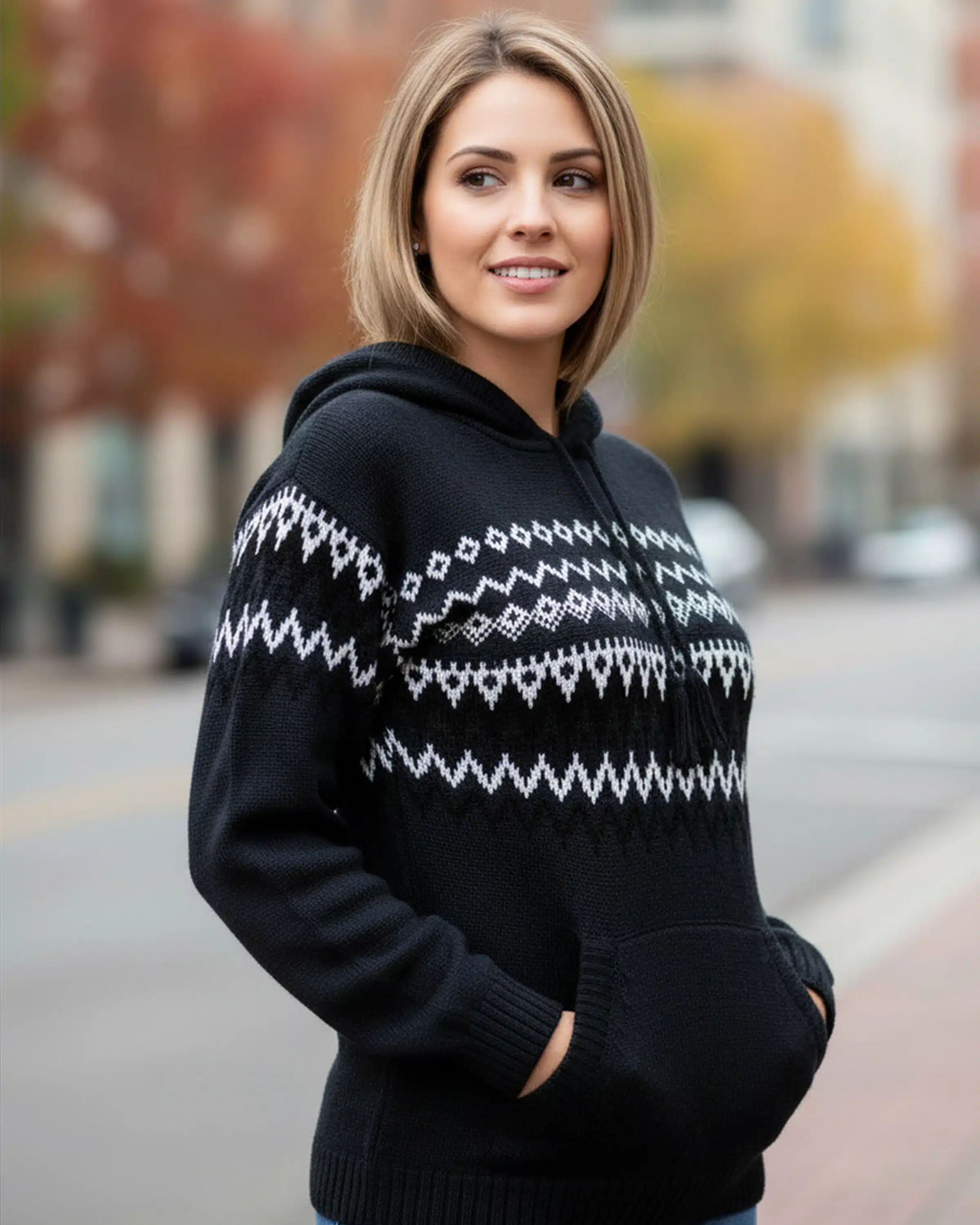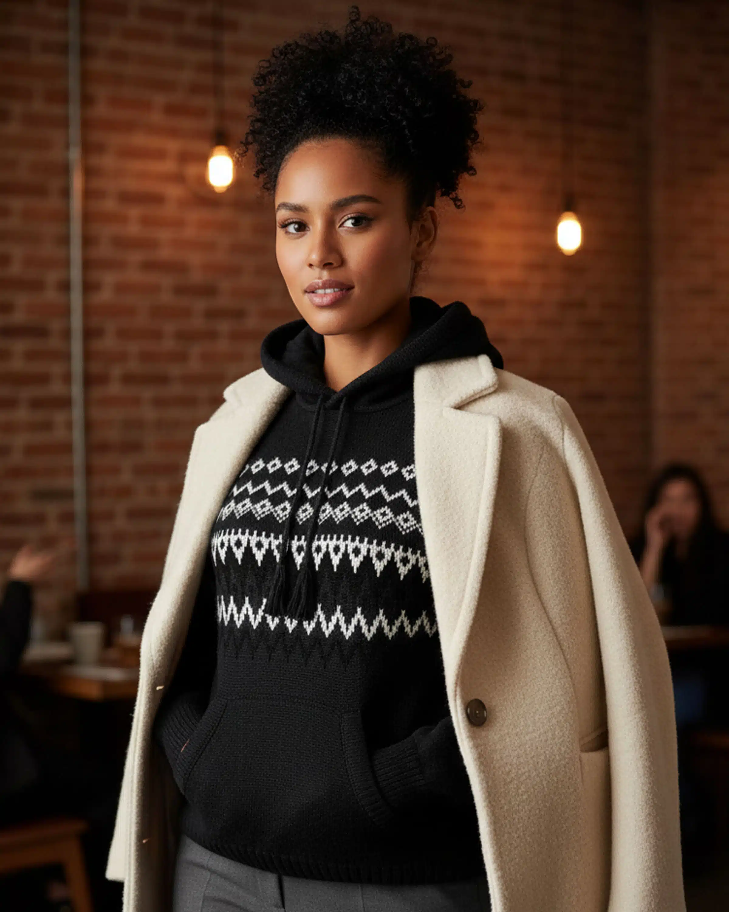 Elevate your cold-weather wardrobe with the Fair Isle Knit Hoodie, a women’s hoodie made from soft and lightweight alpaca wool. Designed for comfort and practicality, this pullover includes a functional kangaroo pocket, perfect for keeping your hands warm or carrying small essentials.