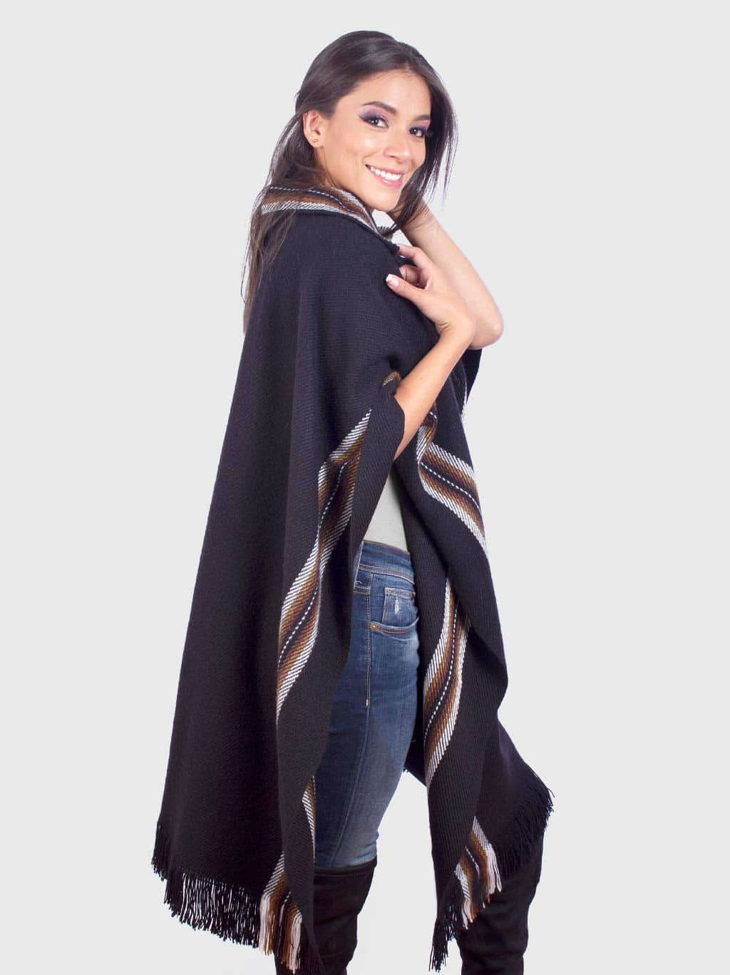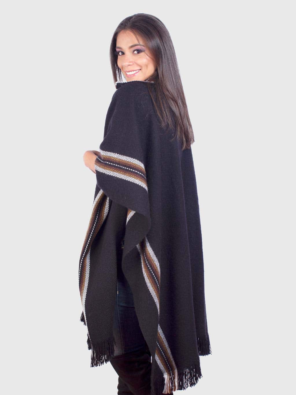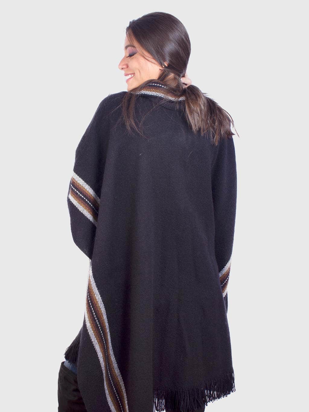 This black poncho for women, named as “Unay”, has brown stripes in the V-neck and confers a sporty look that can be used during all the year. Its lightweight and softness are perfect for informal reunions with friends and family.
