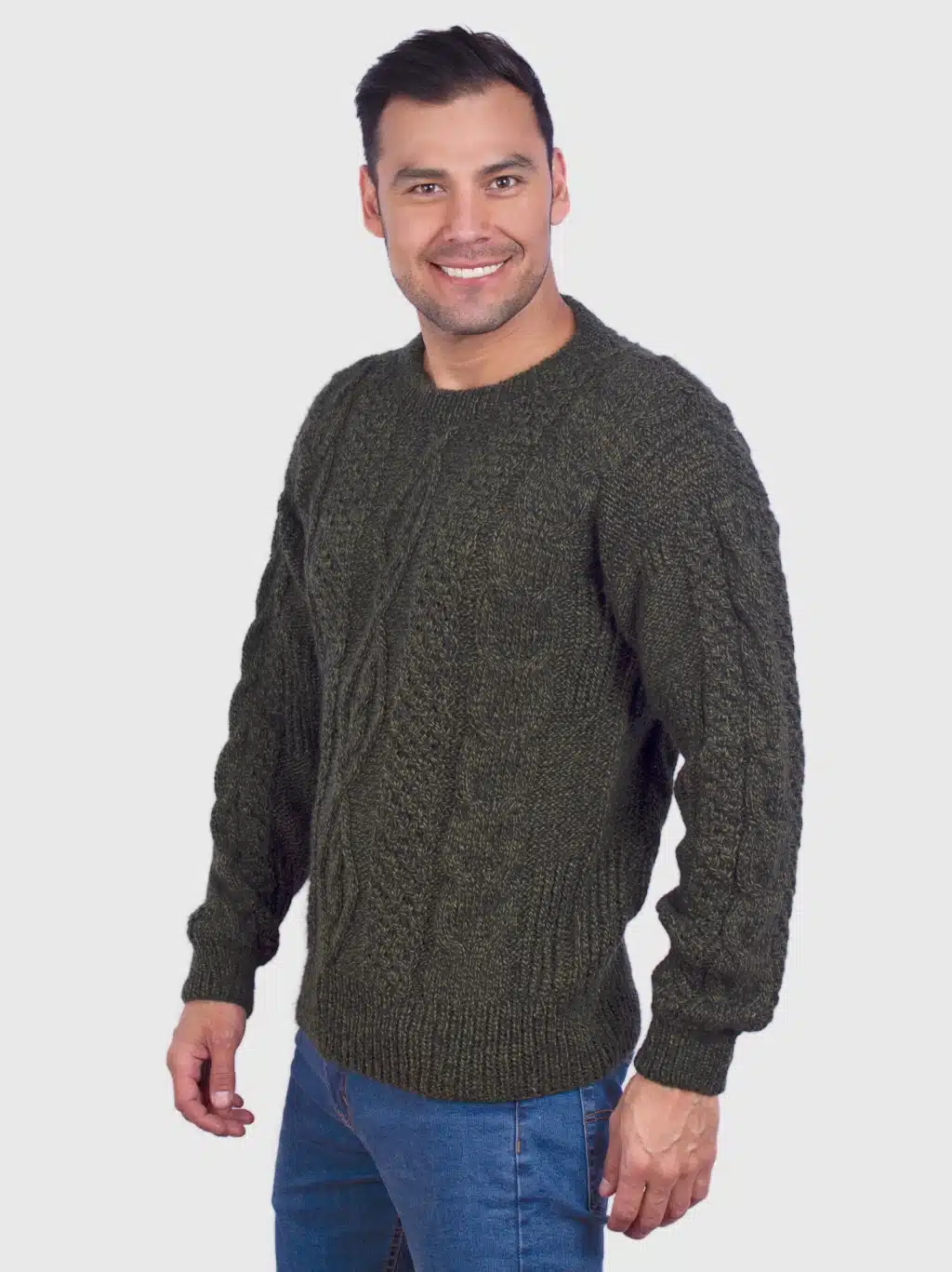 This dark green melange men’s sweater handmade of alpaca wool by Peruvian artisans, with a round neckline and long sleeves, is perfect for use during the winter season.