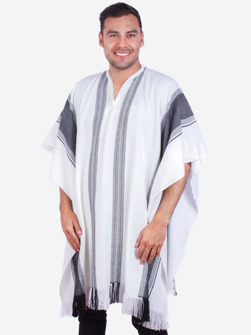 This white V-neck poncho for men is named as “Austin”. It is a Peruvian artisan cape composed of selected alpaca wool. It has a V-neck and a gray charcoal pattern , which give a casual and elegant look, plus is lightweight and softness make it perfect to wear year-round!