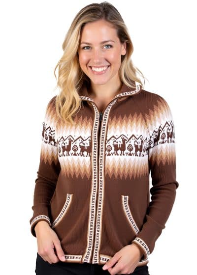 INTI ALPACA Brown Alpaca Wool Hoodie for Women – Full Zip Up Cardigan with Andean Pattern