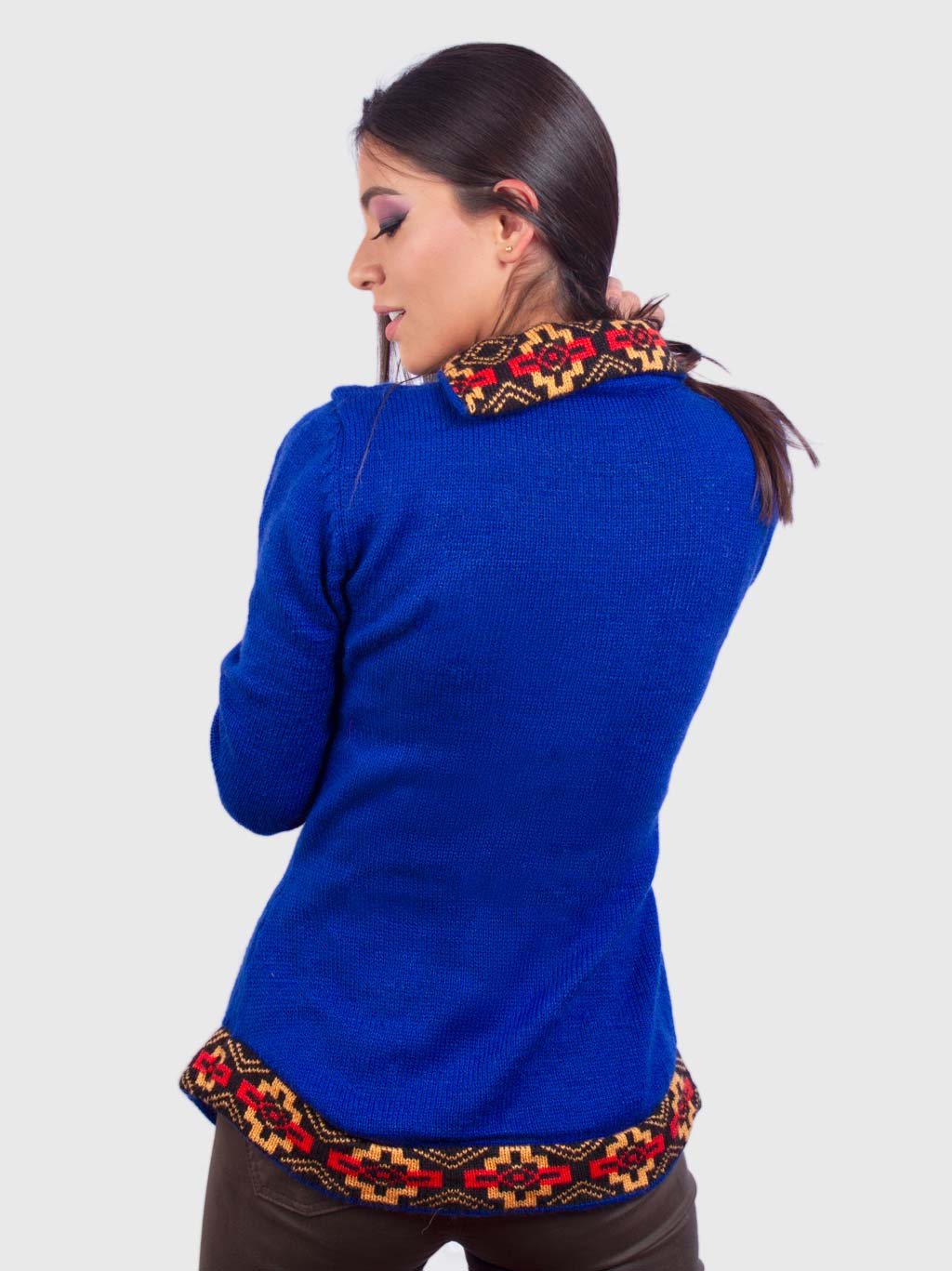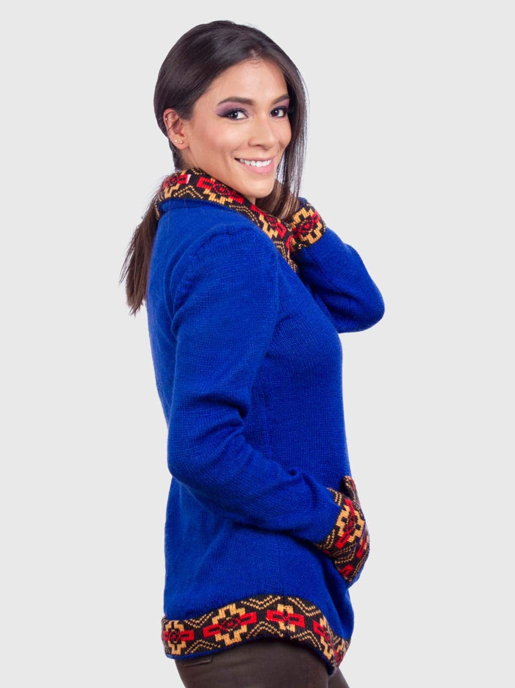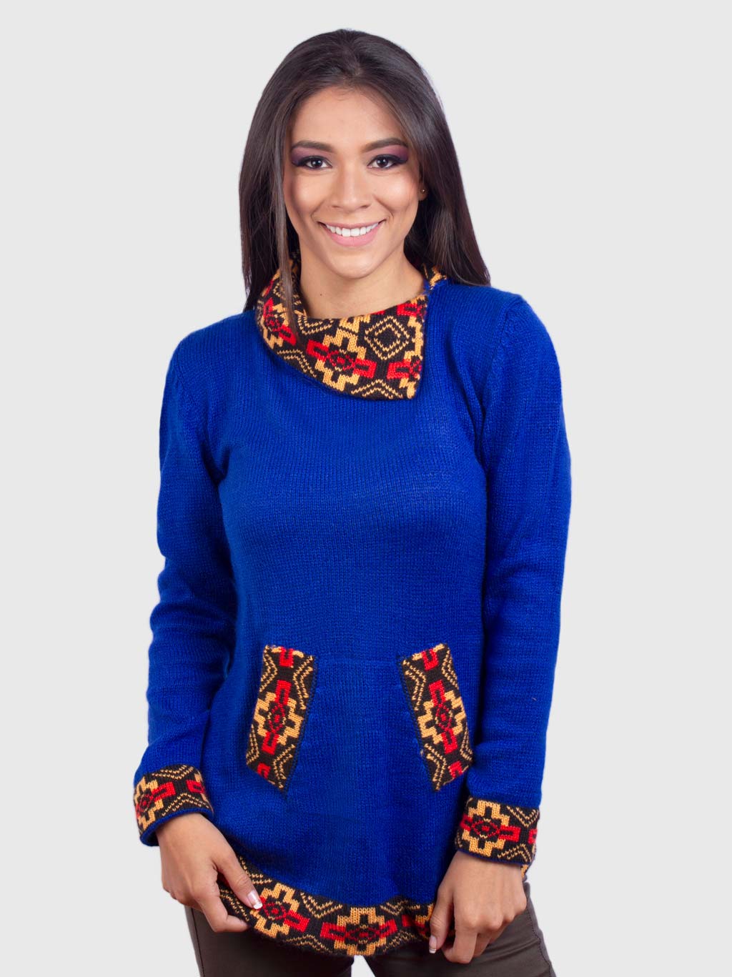 This blue turtleneck sweater for women is handmade by Peruvians crafters with alpaca wool. Its light-weighted cloth can maintain you warm and cozy in the winter season, plus it has a combination of colors in the neck, pockets, fists, and hem of sand tones that give a vibrant image. The long-sleeved knit sweater features two pockets, excellent for keeping hands warm.